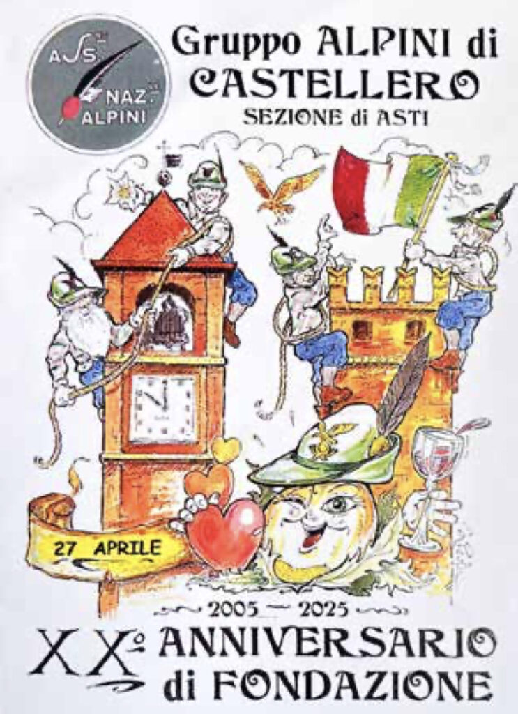 (In gallery la  locandina realizzata da Marcello Peola per il ventesimo anniversario del Gruppo Alpini di Castellero)