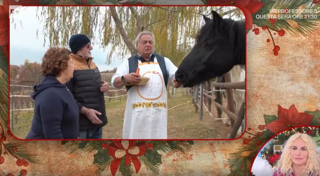 Infatti è andato in onda un servizio in cui Alfio (Bottaro) si è spinto fino ad Asti per consegnare un tronchetto della felicità, fra i dolci natalizi più conosciuti, a Guido Accomasso e alla moglie Grazia in occasione del loro cinquantesimo anniversario di matrimonio. Una sorpresa organizzata dalla figlia Elettra con la complicità della sorella Carlotta. Al suo arrivo Alfio è stato accolto dalla coppia e Guido (molto conosciuto in città per le sue competenze tecniche in campo elettronico e per essere stato per anni il responsabile della sicurezza in tribunale) lo ha poi “presentato” ai suoi “nipoti a quattro zampe”, i cavalli. E Alfio si è prestato allo scherzo di ripulire i box (con tanto di molletta al naso) e dividere le carote con gli animali.