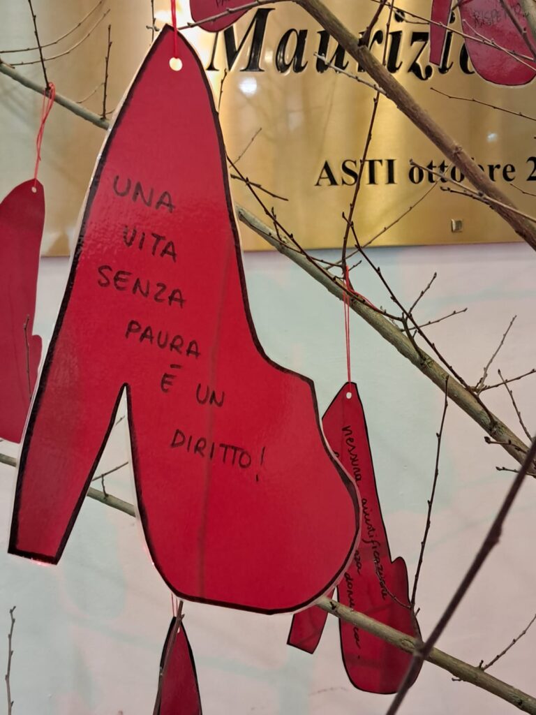 Un’installazione semplice ma di grande effetto visivo e simbolico quella che questa mattina è stata svelata nell’atrio del tribunale di Asti in occasione della giornata contro la violenza sulle donne.