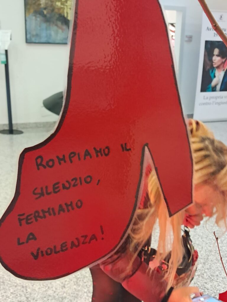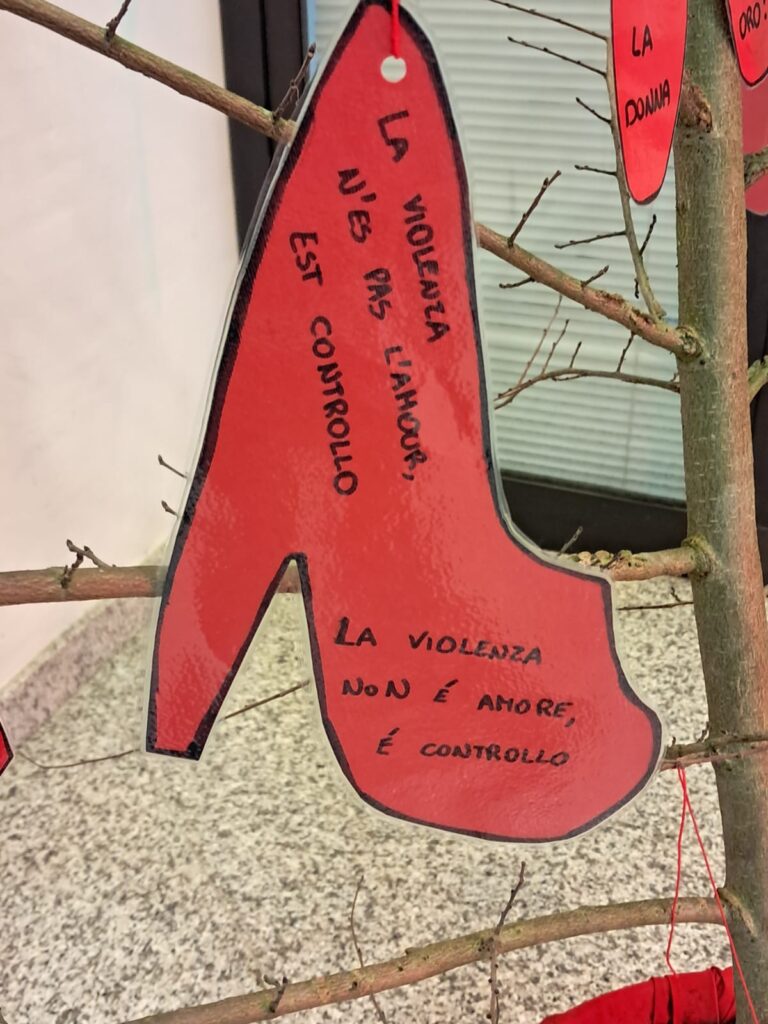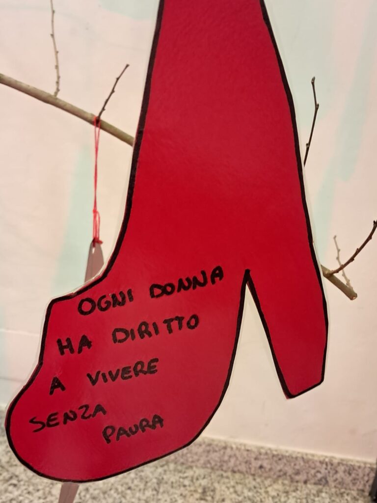Un grande albero secco al quale sono stati appesi tanti cartoncini rossi a forma di scarpetta, simbolo dell’impegno di tutti contro i crescenti femminicidi. Su ogni scarpetta una frase sulla libertà delle donne, sul loro diritto ad autodeterminarsi e a pretendere un amore vero.