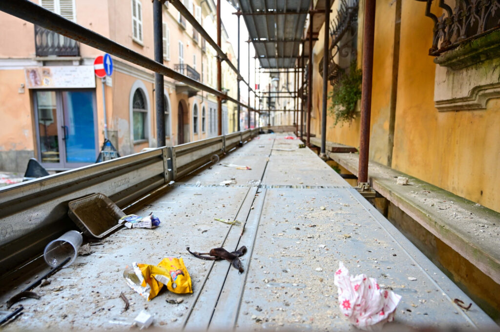 E se non bastassero i danni del tempo e dell’incuria, arrivano anche quelli dei senzatetto e dei vandali a metterci il carico da undici. Con un ponteggio allestito da 3 anni in attesa della conclusione delle diatribe giuridiche, Palazzo Gazelli è stato più volte violato, con ingressi sia da una porticina su strada (oggi murata) sia dalle finestre ai piani superiori raggiunte attraverso il ponteggio (le cui botole sono state poi bloccate). I segni dentro i saloni sono rimasti: dai corridoi usati come gabinetto alle bottiglie di birra vuote lasciate a terra e, nel primo cortile in cui è installata la gru inutilizzata, il mucchietto di cenere rimasto dopo l’incendio dei cavi elettrici da cantiere per rubare il rame contenuto.