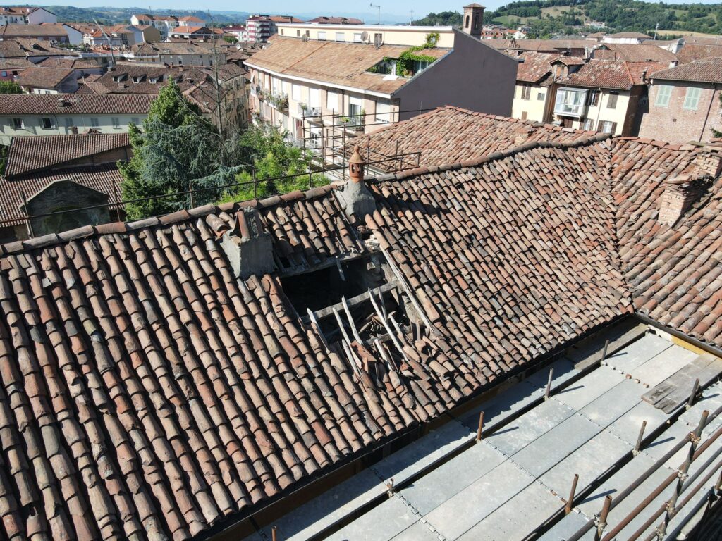 A cedere, negli anni, è stata la copertura: dalle tegole alle travature che sostenevano il tetto, torre compresa, e questo sta già provocando danni da infiltrazioni. Ogni volta che piove, ci sono buchi nel tetto che fanno passare l’acqua impregnando muri, solette e gli orditi di legno che “mettono in forma” le tante tipologie diverse di soffitti di cui il palazzo può vantarsi. L’acqua infiltrata dal tetto trasforma i muri e i soffitti dei piani di sotto in enormi spugne che, nonostante il loro spessore, ad un certo punto esauriscono la capacità di assorbire e collassano. Con un disastro a catena perché dai piani superiori, visto proprio lo spessore dei muri, i crolli peserebbero inevitabilmente sui piani inferiori rovinando irreparabilmente il gioiello medievale con totale ristrutturazione seicentesca a cura dell’architetto Benedetto Alfieri.