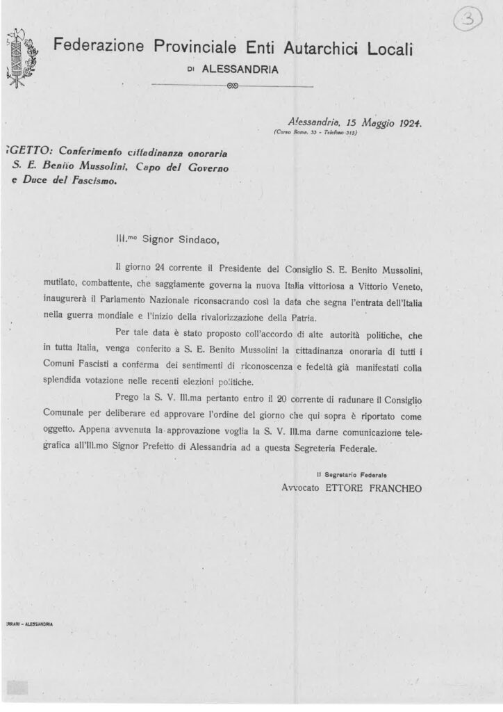 Un altro aspetto non secondario della faccenda è proprio il modo con cui venne concessa la cittadinanza onoraria a Mussolini in quel 24 maggio 1924. In una lettera scritta il 15 maggio 1924 dall'avvocato e Segretario Federale Ettore Francheo della Federazione provinciale degli Enti Autarchici Locali di Alessandria (da cui dipendeva anche Asti), che reca come oggetto "Conferimento cittadinanza onoraria S. E. Benito Mussolini Capo del Governo e Duce del Fascismo" i toni usati per rivolgersi ai sindaci non sono propriamente quelli di un suggerimento informale su cui aprire una discussione: «Per tale data (24 maggio 1924 ndr) - scrive Francheo - è stato proposto con l'accordo di alte autorità politiche, che in tutta Italia venga conferito a S. E. Benito Mussolini la Cittadinanza Onoraria di tutti i Comuni Fascisti a conferma dei sentimenti di riconoscenza e fedeltà già manifestati con la splendida votazione nelle recenti elezioni politiche. Prego la S.V. Ill.ma pertanto entro il 20 corrente di radunare il Consiglio comunale per deliberare ed approvare l'ordine del giorno che qui sopra è riportato come oggetto. Appena avvenuta l'approvazione voglia la S. V. Ill.ma darne comunicazione telegrafica all'Ill.mo Signor Prefetto di Alessandria e a questa Segreteria Federale».