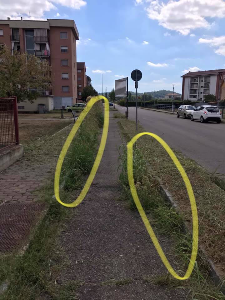 Da via Torchio e via Scotti altri cittadini hanno segnalato che nelle aree verdi è stata tagliata l’erba che era cresciuta, anche in questo caso, “del tutto incontrollata e oltre ogni limite accettabile”, “ma le erbacce lungo i marciapiedi non sono sono state tolte: perché?”