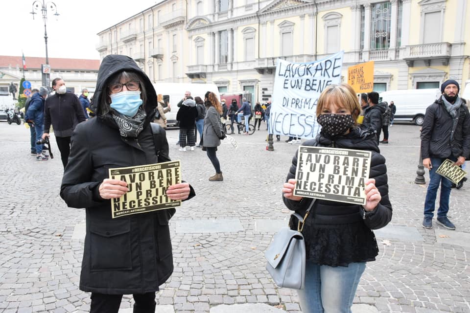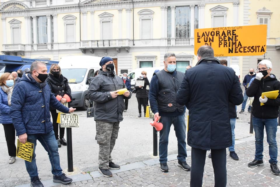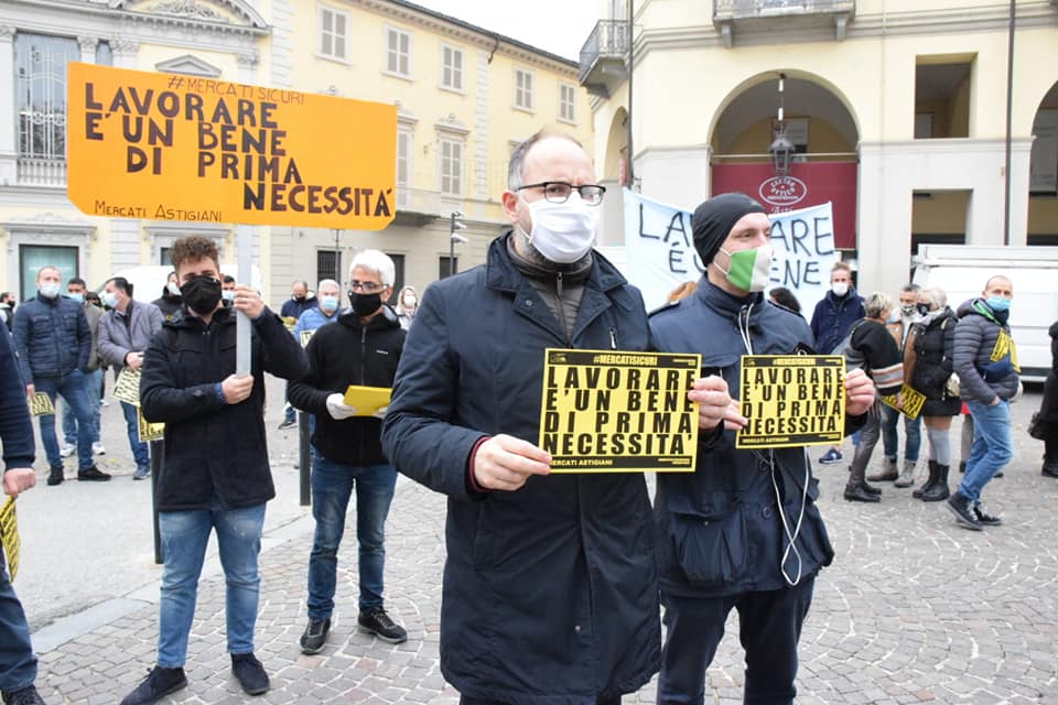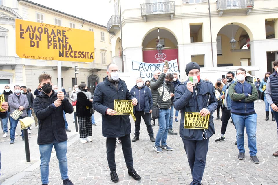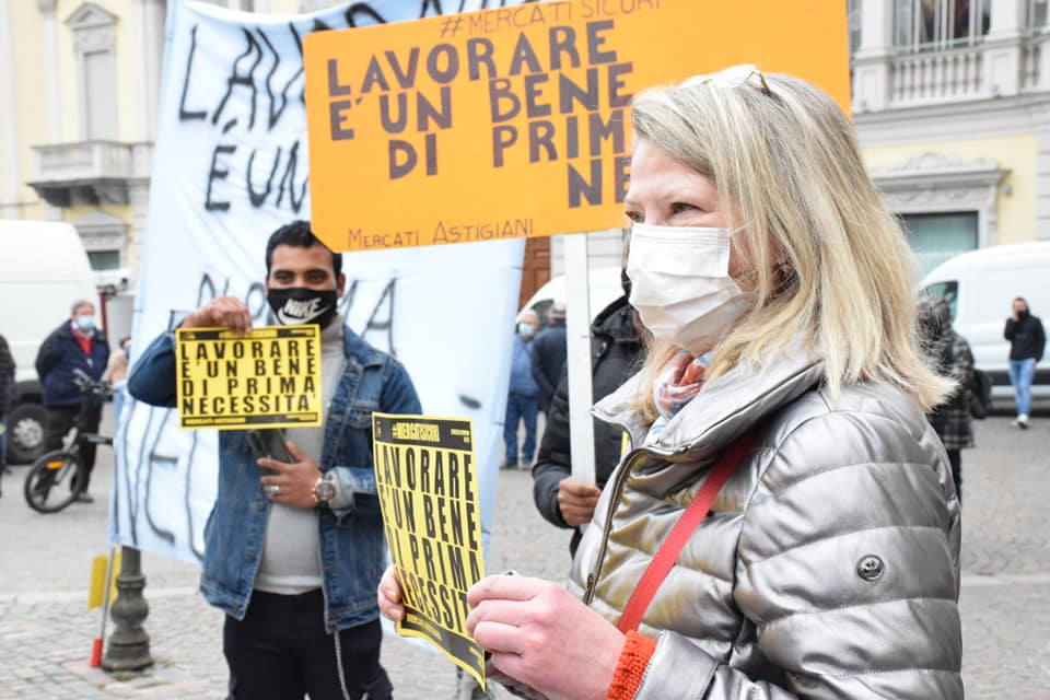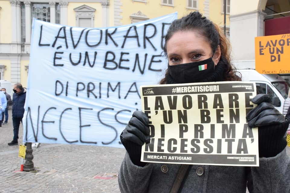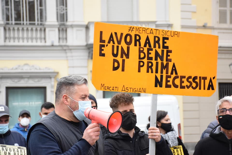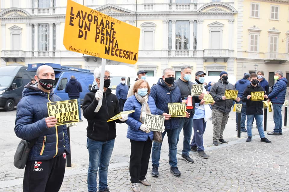 «Lavorare è un bene di prima necessità». Questo lo slogan/appello che gli ambulanti dei mercati astigiani, la cui attività si è fermata dopo l’approvazione dell’ultimo DPCM anti-Covid, hanno lanciato alle istituzioni, sabato mattina in piazza Libertà.