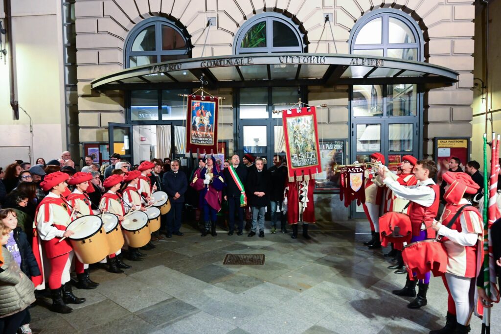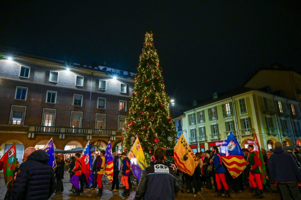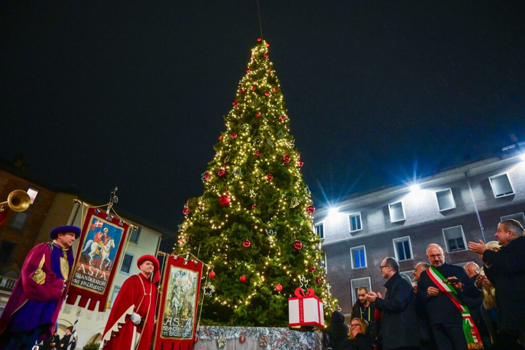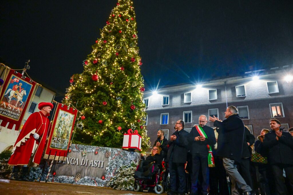 Subito dopo il tramonto, l’attenzione si è spostata verso le piazze limitrofe al municipio. Nonostante una leggera pioggia che non ha scoraggiato i presenti, l’atmosfera è culminata intorno alle 19.45, quando gli sbandieratori dell’Asta hanno accompagnato la cerimonia di accensione dell’albero di Natale in piazza San Secondo. Presenti il sindaco Maurizio Rasero, l’assessore alle Manifestazioni Riccardo Origlia, diversi assessori, consiglieri comunali e il deputato astigiano Marcello Coppo. Immediatamente dopo, le luci si sono accese simbolicamente anche in piazza Alfieri dando ufficialmente il via al format natalizio.