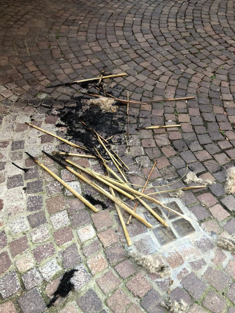 Sdegno e amarezza a Moncalvo per un grave gesto avvenuto in vicolo 27 Gennaio: ignoti hanno dato fuoco alle ramaglie sopra le pietre d’inciampo dedicate a quattro concittadini deportati e uccisi ad Auschwitz.