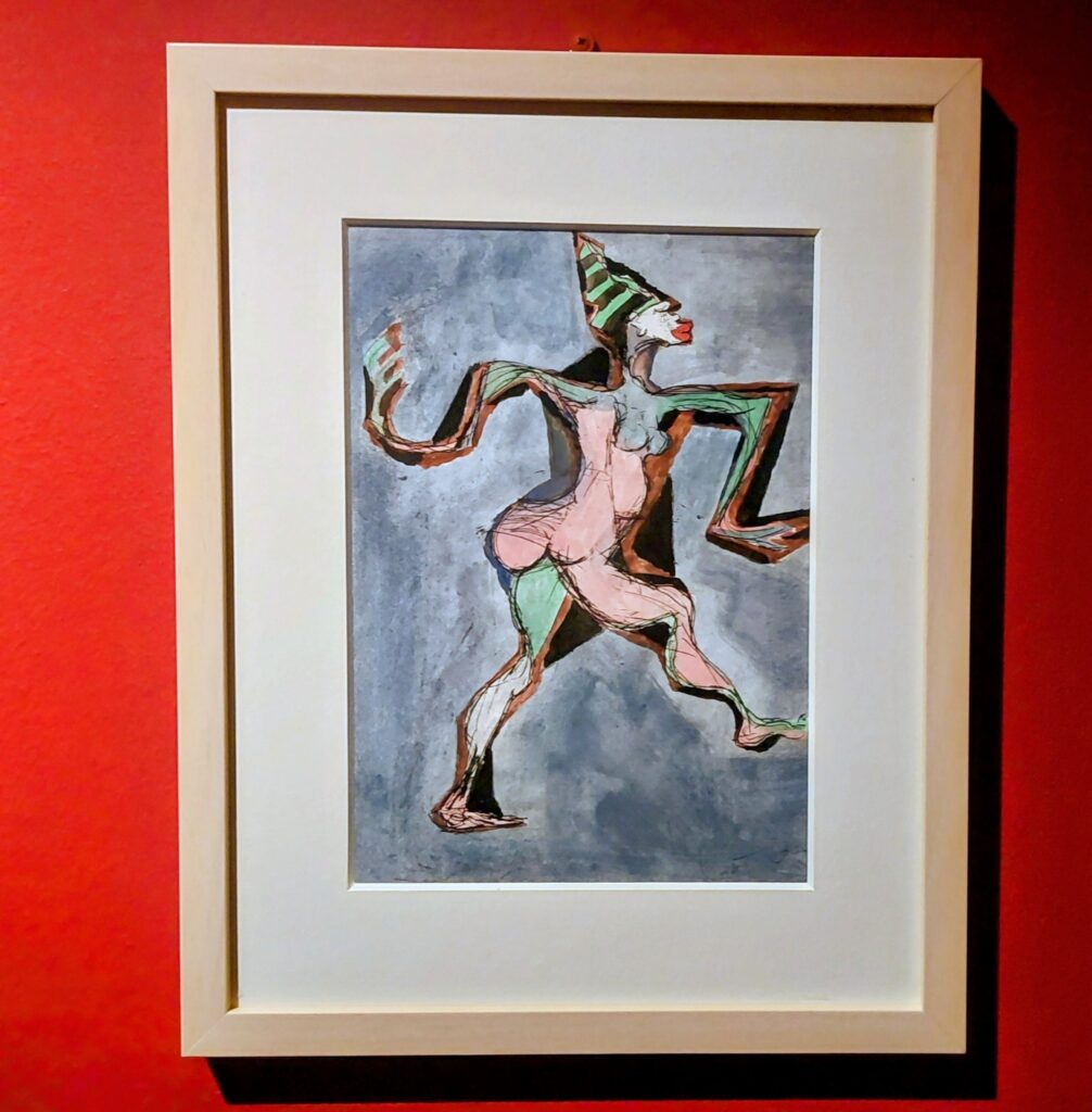 Il primo è dedicato alle opere inedite, tra cui “Higginbotham” del 1957, a tempera e inchiostro, dedicata a uno dei primi grandi trombonisti jazz. Dipinta all’età di soli vent’anni, cattura l’attenzione per il contrasto tra l’azzurro del guazzo annuvolato dello sfondo e il rosso del tratteggio minuzioso dell’inchiostro.