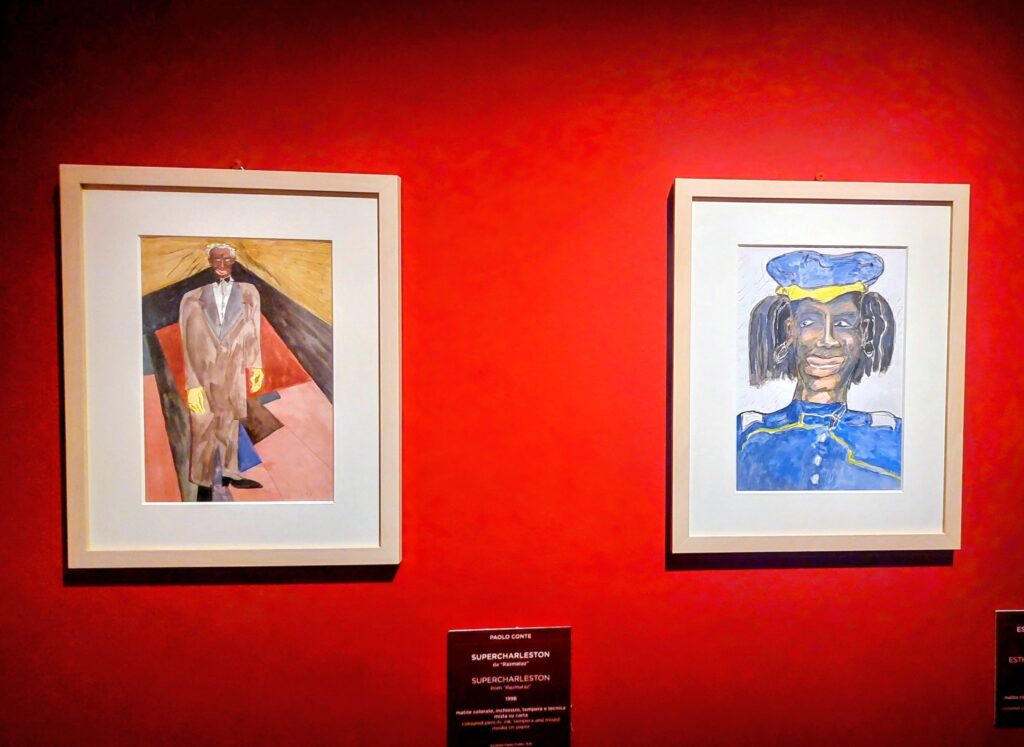 Il secondo è costituito dalla selezione tra le oltre 1.800 tavole di “Razmataz”, l’opera che Paolo Conte ha interamente scritto, musicato e disegnato. Ambientata nella Parigi vitale e autunnale degli anni Venti, l’opera celebra – dietro la misteriosa scomparsa di una ballerina – l’attesa e l’arrivo in Europa della giovane musica americana, il jazz. “Razmataz” svela quindi la capacità di Paolo Conte di fissare sulla carta atmosfere e personaggi, in una libertà formale che richiama le avanguardie del primo Novecento.