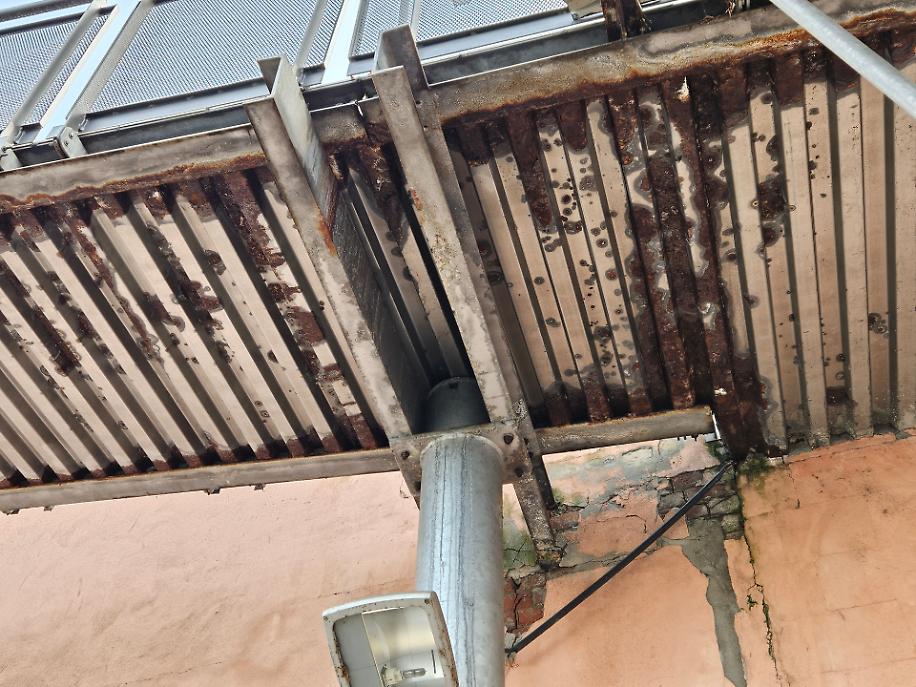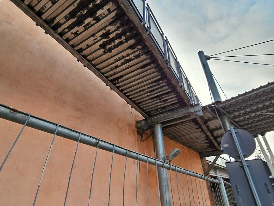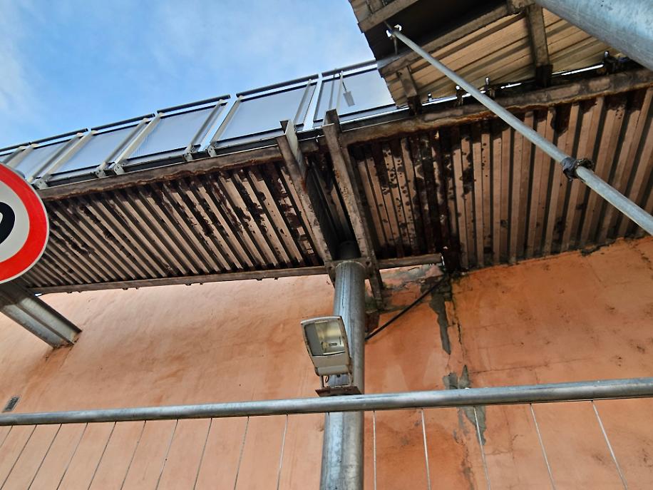 I danni dati dalle infiltrazioni dell'acqua piovana sono visibili soprattutto passando sotto la struttura, a ridosso degli stalli dove sostano i bus extraurbani. Per questioni di sicurezza anche il marciapiede sottostante la passerella è stato in parte trincerato come il lungo corridoio interno che è stato limitato da del nastro.
