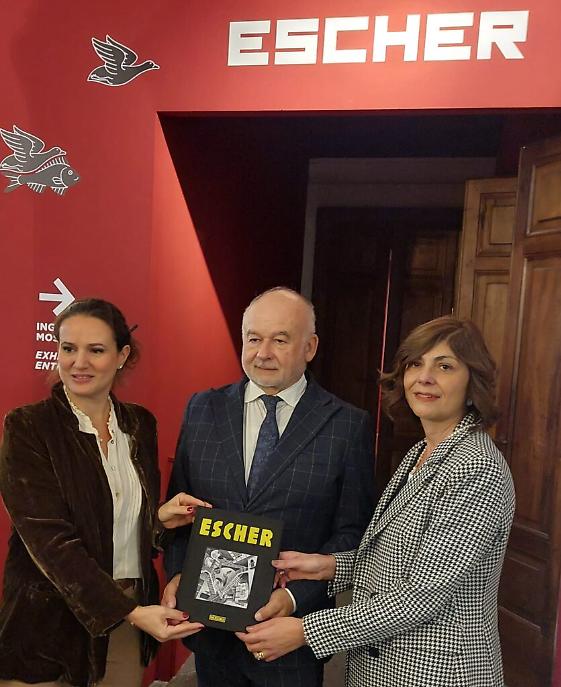 «Mi ritengo davvero fortunato - ha commentato Francesco Antonio Lepore, presidente della Fondazione Asti Musei - nell‘iniziare il mio mandato alla guida dei musei astigiani con la mostra di un artista che ha saputo esplorare, con genialità e il supporto esclusivo della maestria grafica e delle competenze matematiche, quegli universi impossibili che oggi appaiono più vicini grazie agli algoritmi e all‘intelligenza artificiale. Escher è un artista sempre attuale e le sue opere sono da quasi un secolo le icone ammalianti delle infinite possibilità di interazione tra arte e scienza». Il percorso espositivo, deciso dal precedente consiglio di amministrazione, è stato curato dalla società Arthemisia, che dal 2018 affianca Asti Musei nella realizzazione delle cosiddette “grandi mostre”, cominciate con l’esposizione dedicata alle opere di Chagall. «Nel caso specifico - ha proseguito Lepore - si tratta di una esposizione gradevole, divertente, accessibile a tutti, dai bambini agli appassionati di matematica, ricca di contributi video, angoli per selfie, giochi e postazioni per sperimentare di persona le teorie matematiche affrontate dall’artista». «E’ un viaggio emozionante - ha aggiunto Livio Negro, presidente della Fondazione CrAsti - attraverso la mente di un artista che ha saputo unire arte, matematica e filosofia in un modo unico ed originale. Sono sicuro che non solo arricchirà l'offerta culturale della città, stimolando un dialogo attivo tra arte, scienza e comunità, ma coinvolgerà in modo attivo tutti noi». A sottolineare l’importanza dell’investimento della Fondazione Asti Musei a favore di tutta la città il sindaco Maurizio Rasero. Gli ha fatto eco Iole Siena, presidente e amministratore delegato di Arthemisia. «Come affermano i dati Istat - ha ricordato - ogni visitatore di una mostra d’arte porta un indotto di 60 euro alla città che ospita l’esposizione, per cui le mostre rappresentano un ottimo investimento su una città».