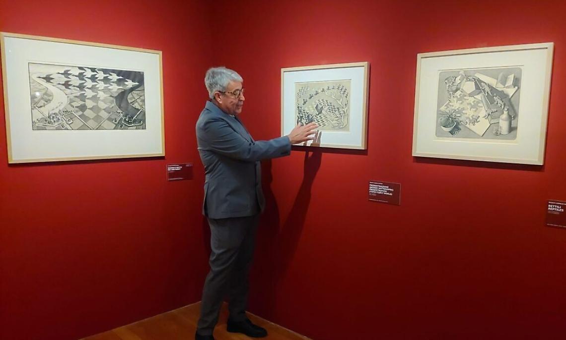 Il curatore ha poi ricordato un’altra svolta nell’arte di Escher, avvenuta nel 1954, quando iniziò un dialogo serrato con matematici e cristallografi, fonte di ispirazione per la sua ricerca su strutture impossibili, illusioni ottiche e rappresentazioni dell’infinito. «A questo proposito si possono ammirare qui alcuni suoi capolavori. Basti pensare a “Belvedere”, in cui la scala disegnata all’esterno del palazzo diventa interna, oppure "Salita e discesa", in cui viene rappresentato un movimento senza principio nè fine, o ancora all’opera “Concavo e convesso”, in cui il pavimento è contemporaneamente soffitto, determinando la percezione contemporanea di una superficie solida sia concava che convessa. Propone cioè situazioni che, in base alla logica, non sono possibili».