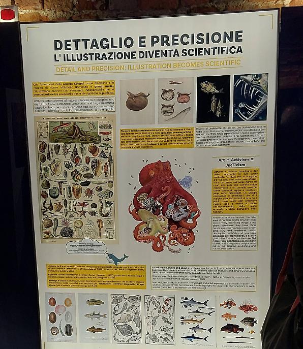 La situazione cambiò con l'affermarsi delle scienze naturali (secondo pannello). «L'illustrazione - ha continuato il direttore - diventò uno strumento indispensabile per scienziati e divulgatori. Prima dell'avvento della fotografia subacquea, il disegno scientifico fu l'unico modo per catturare i colori vivaci e i dettagli anatomici osservati al microscopio».