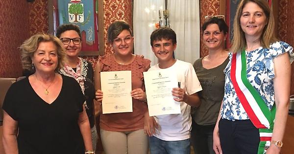 Il sindaco Macchia, che per dare ufficialità alla cerimonia ha indossato la fascia tricolore, prima della foto ricordo si è rivolta ai ragazzi con affetto: "La conoscenza va nutrita, vi auguro un felice percorso non solo scolastico, ma nella vita". Per ora i pensieri di Giada e Fabrizio sono concentrati sulle vacanze e su come gestire l'inatteso tesoretto ricevuto dal Comune.