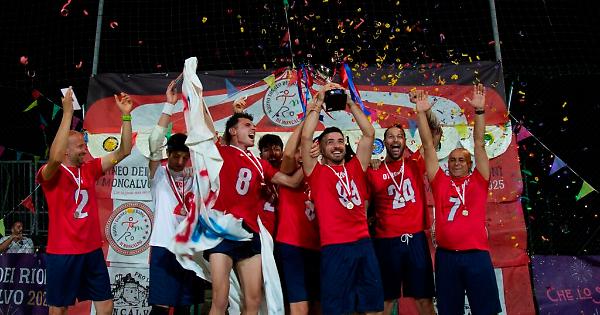 Medaglia d’oro al collo e nastri rossi e blu sulla coppa, alzata al cielo dal capitano dei Gessi Roland Kapllani di fronte a un pubblico da record, tra le note dell’intramontabile “We are the champions” dei Queen. E’ questa l’ultima immagine che ci regala l’edizione 2025 del Torneo dei Rioni di Moncalvo, vinta dal Rione Gessi al termine di una finale il cui tabellino recita un netto 5 a 1, ma nella quale il Cissello ha avuto il merito di restare in partita per oltre metà della gara.