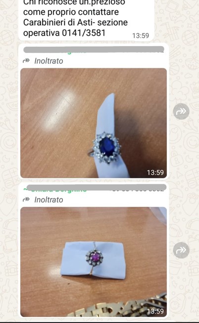 Ma, e questo è l'appello che arriva dal Comando provinciale, chi abbia subito un furto di gioielli è pregato di rivolgersi ai carabinieri di Asti o alla caserma della propria zona per visionare le stesse foto e procedere ad un eventuale riconoscimento.