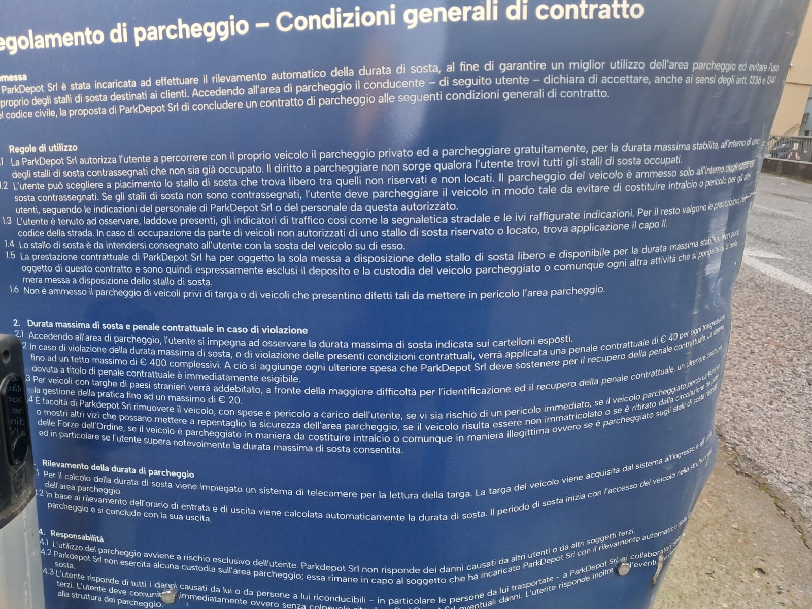 «Riguarda l'applicazione dell'articolo 1341 del Codice Civile. Le condizioni generali esposte su cartello contengono clausole vessatorie che, per essere valide, richiederebbero la doppia sottoscrizione dell'utente. Nei parcheggi con condizioni esposte su cartelli è materialmente impossibile ottenere tale doppia sottoscrizione, rendendo inefficaci tutte le clausole penali e le limitazioni di responsabilità.