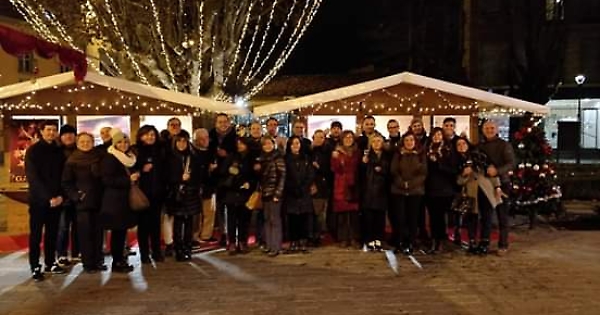 Auguri sotto il platano secolare di piazza Cavour per i commercianti. La rinata associazione “Canelli C’è” e l’amministrazione comunale hanno voluto salutare il Natale, e la rinvigorita collaborazione, con il tradizionale brindisi delle festività. A far da corollario il maestoso affusto che domina l’area pedonale trasformato, grazie alla sapiente posa delle luminarie, in una grande coppa di Moscato “Canelli”. Ad alzare il calice il sindaco Paolo Lanzavecchia e gli assessori, Annalisa Sacco presidente del sodalizio, Enrico Salsi Fenoglio, consigliere comunale e presidente della commissione consigliare commercio, ed una trentina di negozianti.