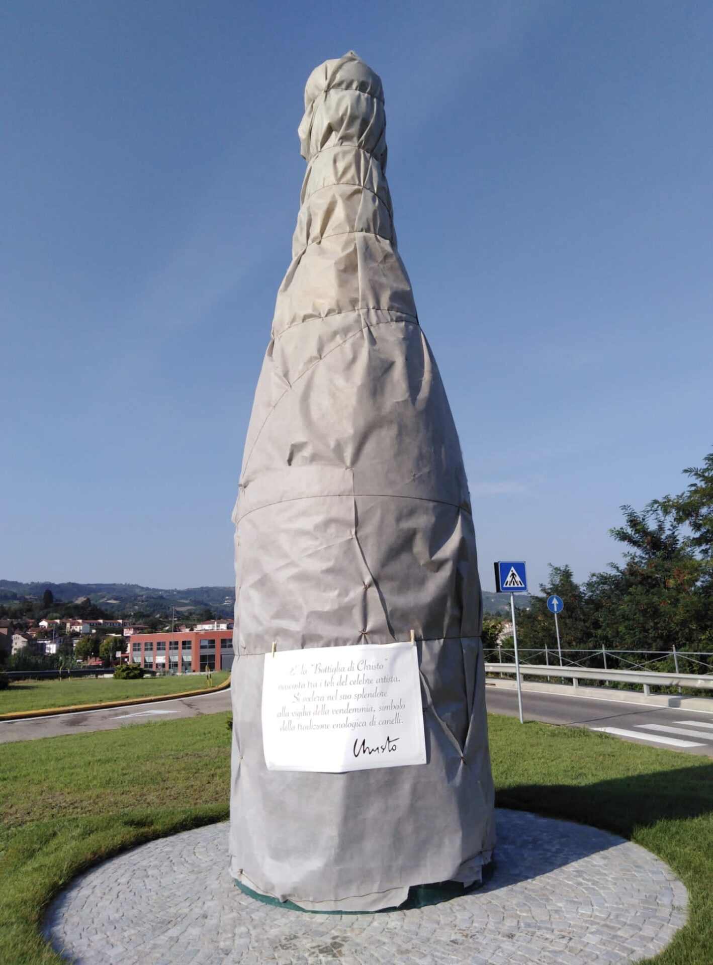 Ha destato curiosità la scritta che, da lunedì campeggia sulla bottiglia “incartata” che domina lo svincolo sul ponte Goria. Soprattutto per la firma in calce all’insolita etichetta: è di Christo, il celebre artista bulgaro Christo Vladimirov Javacheff, uno degli esponenti più importanti della Land Art che dagli anni ’60 aveva scardinato le regole del mondo dell’arte con installazioni artistiche su larga scala, rimanendo un artista amatissimo fino ai giorni nostri. Scomparso lo scorso maggio, aveva fatto clamore l’installazione di pontili galleggianti che avevano permesso di “passeggiare” sul lago d’Iseo nel 2016.