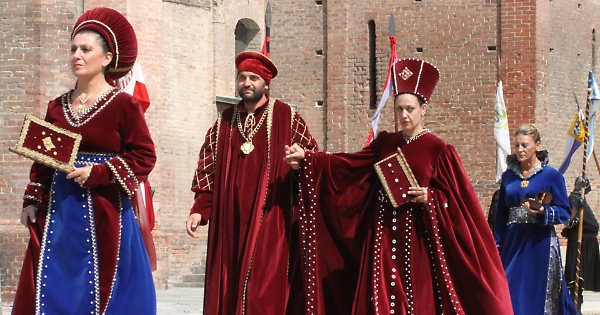 Attraverso i loro abiti di diversi colori, realizzati con pregiate stoffe, gli ornamenti e i gioielli, i figuranti “raccontano” ogni anno, durante il Corteo, la ricchezza e il prestigio vissuti dalla città di Asti, crocevia di mercanti e banchieri, in epoca medioevale.