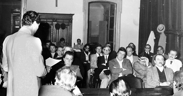 Un altro tuffo nel passato legato al nostro Palio. Dopo aver rivissuto sull’edizione di venerdì 10 gennaio il post corsa del 1985, andiamo ancora più indietro nel tempo, esattamente al 1977. L’immagine sopra venne scattata nel maggio di quell’anno: l’allora Capitano del Palio Romano Coppellotti, di spalle con il foglio in mano, nel corso di una riunione parla ai Rettori. Quell’anno furono in quindici i Comitati a contendersi il Drappo dipinto da Gea Baussano.