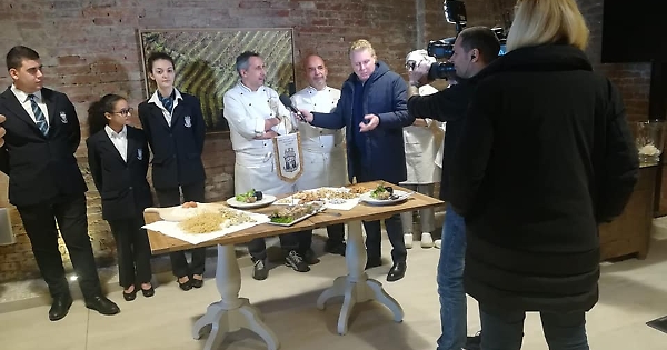 Nella cornice di Villa Fontana ad Agliano, alla presenza del presidente della scuola Dino Aluffi e del direttore Davide Rosa, sono stati protagonisti gli alunni di sala e cucina e gli insegnanti, che hanno presentato le tipicità del territorio trasformate in gioielli della cucina monferrina, a partire dai vini della zona e produzioni tradizionali come le nocciole. Di fronte alle telecamere, con gli chef Gianni Bonadio e Gino Minacapilli e il maitre Luca Icardi, ha così sfilato una gustosa terrina di bollito servita con gelatina e accompagnata da un bagnetto ai peperoni: un piatto che racchiude tutti i pezzi del tradizionale bollito misto, ma proposto in una forma alternativa al classico modo in cui siamo soliti gustarlo. Inoltre, in primo piano le nocciole, ingredienti di tanti dolci della tradizione piemontese: sono stati presentati infatti i tipici “brut e bon”, nocciole con la glassa e biscotti alle nocciole.
