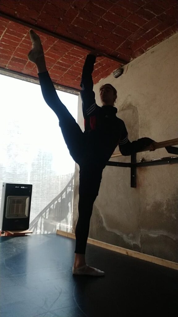 Il padre Marco lo ha sistemato sotto il portico, chiuso con teli di plastica e riscaldato per le lezioni invernali, con Ia complicità dei vicini di casa che hanno dato la loro disponibilità affinchè il passaggio comune, per alcune ore del giorno, fosse trasformato in sala danze. In un angolo il tablet in videochiamata con l’Accademia di Mosca e le indicazioni dei maestri di danza. Con la speranza di tornare presto in classe al Bolshoi.