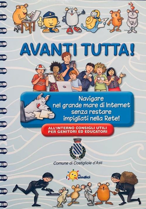“Avanti tutta!”, edito dalla casa editrice “I quindici”, fornisce innanzitutto indicazioni su che cosa sia internet e come ci si “collega” alla “rete”, i social network, chat, la posta elettronica, app, le icone e le emoticon; e fornisce poi una serie di consigli su come “usare” internet, per evitare pericoli o comportamenti che possono risultare dannosi. Si toccano, ad esempio, i temi delle informazioni o fotografie da “postare” o meno sui social, del rischio della dipendenza da internet, del fenomeno degli “smombie”, ossia coloro che camminano per strada a testa bassa guardando il telefonino. Inoltre, un utile glossario delle parole del mondo di internet, una pagina dedicata alla polizia postale, specializzata nel contrasto ai reati messi in atto attraverso i mezzi di comunicazioni e che svolge un’importante opera di prevenzione; e l’indicazione a rivolgersi agli adulti per ogni situazione anomala. «Ringraziamo i tanti sponsor locali che hanno sostenuto l’iniziativa: grazie al loro contributo si è potuto realizzato l’opuscolo, distribuito in questi giorni in tutte le scuole del Circolo: Costigliole, Castagnole Lanze, Calosso e Isola - aggiunge il sindaco Cavallero - Questa è solo una delle tante iniziative a cui abbiamo pensato: presto prenderanno il via gli incontri informativi per la popolazione con i carabinieri, con appuntamenti sul territorio, in particolare nelle frazioni. Abbiamo poi intenzione di intraprendere con i ragazzi delle scuole un percorso di educazione alla legalità, perché i bambini crescano con la necessaria consapevolezza».