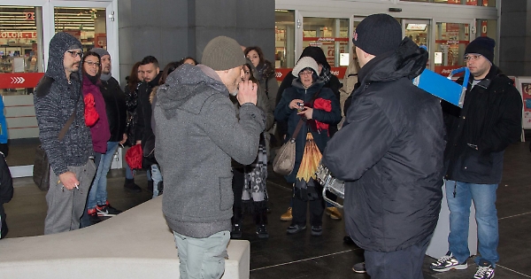 Alcuni dipendenti di Media World in sciopero davanti all'esercizio commerciale del Borgo