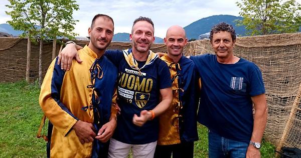 Nella foto, scattata a Feltre: Antonio Siri, terzo da sinistra, festeggia il successo per il quartiere Duomo