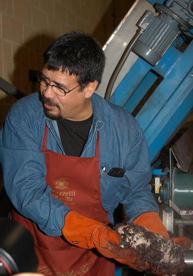 E fin dal primo momento del suo arrivo - in cima alla collina di Altavilla Monferrato - tutti i presenti rimasero emozionati dalla semplicità e dall’autentico coinvolgimento che questo genio della letteratura mostrava nel rapporto con le persone e nella meraviglia che provava per la scoperta di racconti e di note sensoriali. A fine ottobre la distilleria era in pieno fermento e i profumi delle freschissime vinacce piemontesi dovettero ammaliare Sepúlveda lasciando in lui il segno. (Nella foto con il distillatore Sanzio)