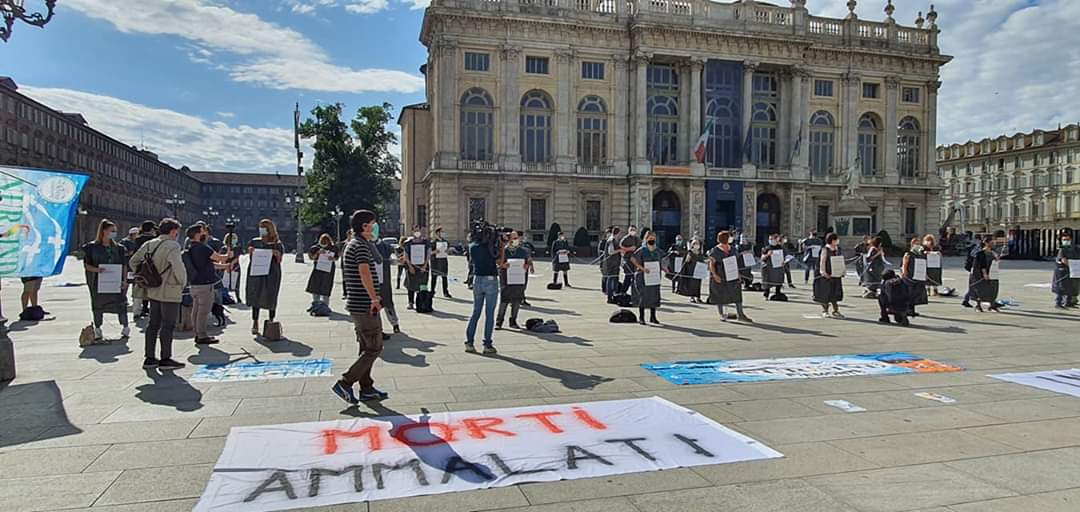Una protesta eclatante, con infermieri sdraiati a terra che rappresentano uno per uno i colleghi morti per Covid. E, oltre alle belle parole e al paragone con gli eroi, chiedono un riconoscimento concreto e tangibile del loro operato in corsia e nei reparti in questi tre mesi di delirio sanitario.