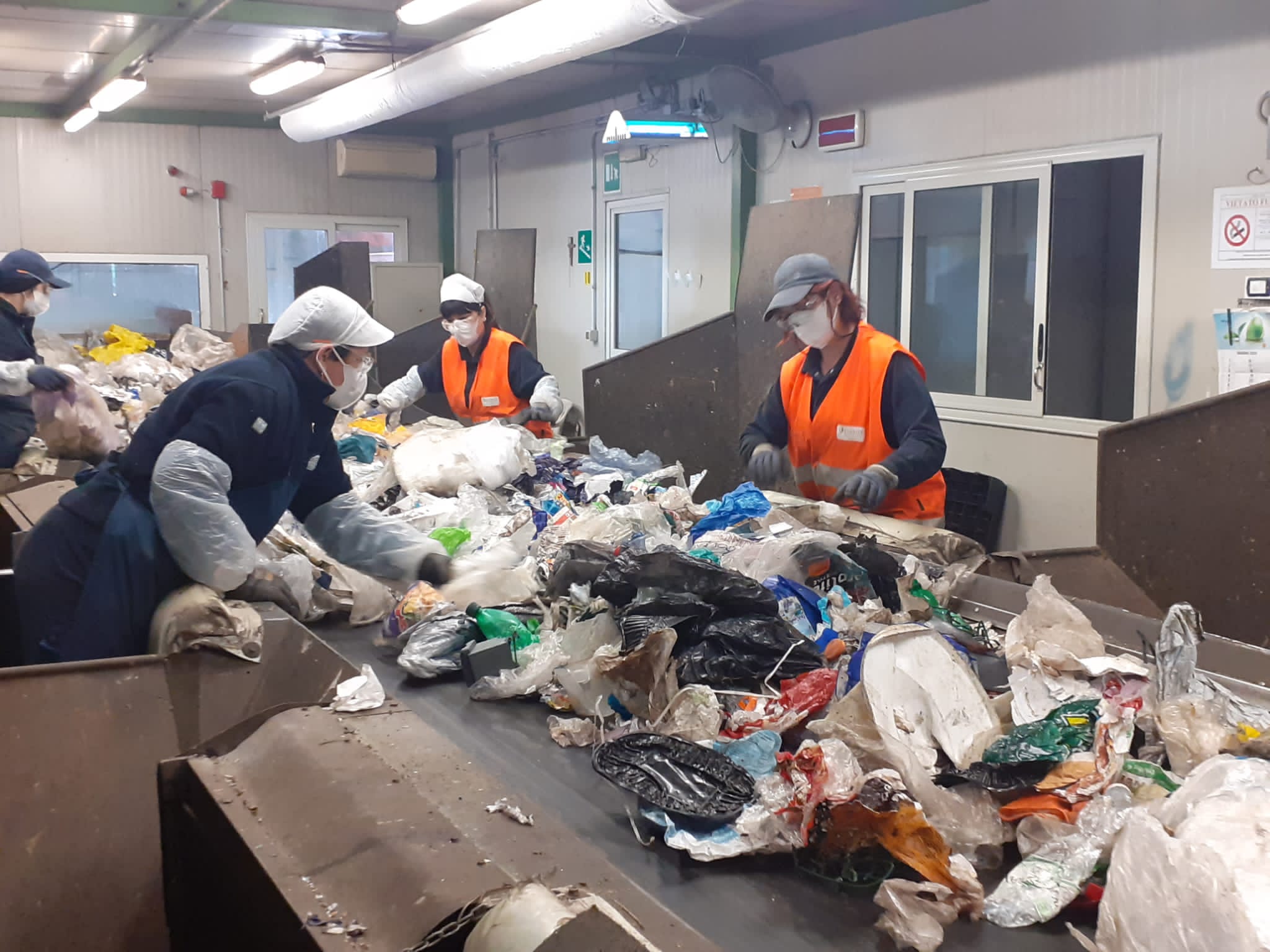 Addetti alla selezione manuale alla linea del riciclo della plastica di Valterza