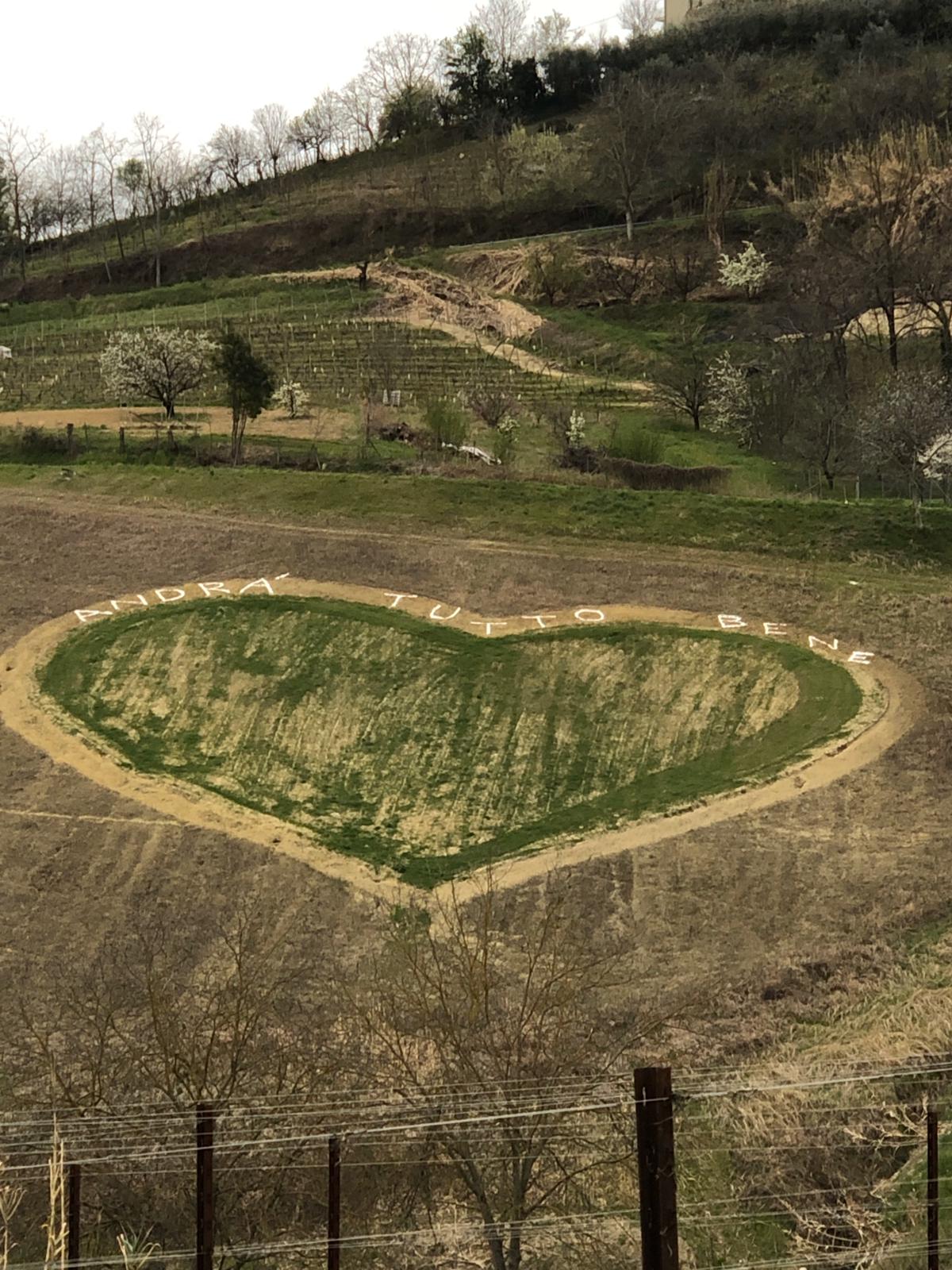Entrambi i cuori racchiudono la scritta che ha dato speranza a tutto il mondo dall’inizio della pandemia da Covid: “Andrà tutto bene”.