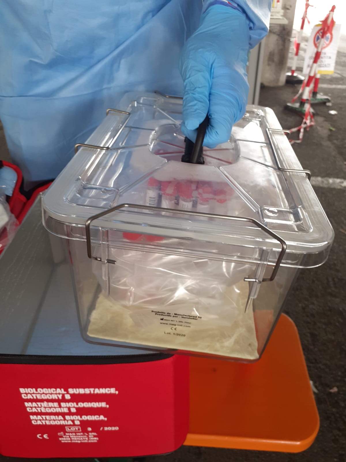 Con la precisione e l’organizzazione di chi ha già fatto migliaia di tamponi, gli operatori svolgono il prelievo al paziente in pochissimo tempo, direttamente dal finestrino dell’auto, all’aperto, per limitare al massimo il pericolo di contagio.