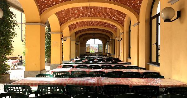 Nella foto: i tavoli sotto i portici comunali attendono di essere occupati.