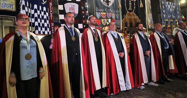 Il programma inizierà alle 21: nella splendida cornice di piazza Cattedrale si ritroveranno il Gruppo del Capitano, gli sbandieratori dell’A.S.T.A., il gruppo dei figuranti e i Rettori (ognuno con indosso il mantello color bordeaux) di tutti i Borghi, Rioni e Comuni, accompagnati dai rispettivi vessilliferi.