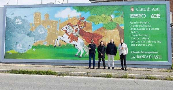 Banca di Asti è da sempre al servizio delle persone e del territorio, promuovendo iniziative di riqualificazione e coltivando una particolare attenzione ai temi legati alla sostenibilità. La più recente iniziativa, patrocinata dalla Città di Asti, ha visto la partecipazione attiva della Scuola di Fumetto e Animazione di Asti, gestita dall’Associazione Culturale ATF. Un nuovo e coloratissimo pannello è stato installato a fianco dell’agenzia 9 di Banca di Asti in Corso Casale, di fronte all’ingresso del Centro Commerciale Il Borgo. I talentuosi studenti della Scuola del Fumetto, Silvia Griffa, Susanna Lovisolo e Matteo Nuzzo, con il coordinamento e la supervisione di Enzo Armando e Marco Avoletta, hanno impreziosito il telo con un disegno vibrante e significativo che rappresenta il Capitano del Palio di Asti nell’atto di sconfiggere, in sella al suo cavallo, le nubi tossiche e inquinanti. Non si tratta solo di un’opera d’arte, ma di un progetto dedicato alla sostenibilità con l’obiettivo di sensibilizzare e richiamare l’attenzione, in modo diretto e immediato, all’ambiente: grazie alla tecnologia Airlite, infatti, le particolari vernici utilizzate si attivano con la luce e, comportandosi come naturali depuratori, eliminano dall’aria gli agenti inquinanti (tra cui ossidi di azoto, benzene e formaldeide) e riducono l’inquinamento atmosferico. Giorgio Galvagno, presidente di Banca di Asti, ha sottolineato l'importanza dell'innovazione per il benessere collettivo: "La nostra missione è sempre stata quella di contribuire al progresso sostenibile attraverso soluzioni innovative. Il telo purificatore d'aria rappresenta un passo significativo verso la realizzazione di questa visione, dimostrando che la tecnologia può lavorare a favore dell'ambiente in modi sorprendentemente creativi. Siamo grati per la collaborazione con la Scuola del Fumetto e l'incessante supporto della Città in questo progetto." L’installazione rappresenta il simbolo dell'impegno congiunto di aziende, istituzioni educative e amministrazioni locali verso un futuro più sostenibile e creativo.