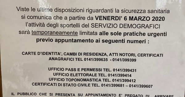 E una volta dentro, le persone potranno accedere solo agli sportelli provvisti di vetro “per quanto riguarda la sicurezza dei nostri impiegati oltre alle consuete norme igieniche – aggiunge la responsabile dei Servizi Demografici – li abbiamo forniti di guanti in lattice per evitare contatti diretti con documenti o penne mentre il personale addetto alla pulizia presta particolare attenzione alla disinfettazione dei vetri delle postazioni.” Per appuntamenti con i Servizi Sociali il numero da contattare è 0141/399490 mentre per Ufficio Pass e Permessi 0141/399431, per Ufficio Elettorale 0141/399414, per Ufficio Toponomastica 0141/399412 e per certificati di Stato Civile 0141/399681.