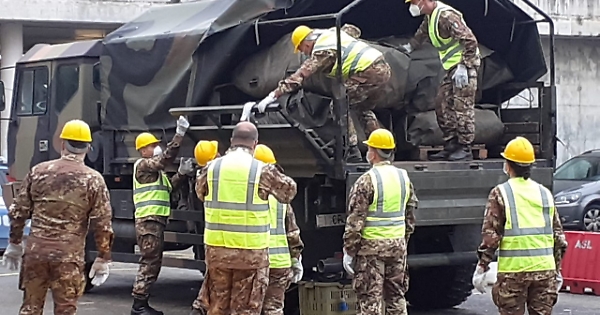 Come si vede dall’immagine, i militari stanno scaricando dal loro mezzo tutto il materiale necessario per montare la tensostruttura. L’opera si è resa necessaria per via della forte diffusione del virus, che a partire da settembre ha ripreso vigore, e per incrementare le disponibilità di posti letto visto che potrebbero tornare utili nel prossimo futuro.