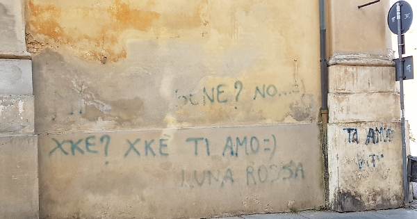 Oggi solo una parte della scritta è visibile, stando all’ortografia neanche la parte migliore, ma dopo tutti questi anni non sarebbe inopportuno che venisse cancellata una volta per tutte nel rispetto della chiesa e tenuto conto che, solo poche settimane fa, il Comune ha inaugurato il recupero conservativo dell’area delle Antiche Mura davanti all’ingresso dell’edificio.