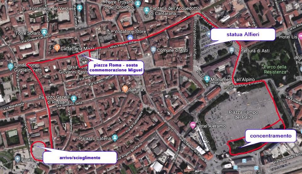 piazza San Giuseppe. Qui ci saranno gli interventi ufficiali del Pride e altri momenti inseriti nel programma dell'evento. La sfilata inizierà alle 17 e durerà poco meno di 2 ore. La stessa sera si svolgerà AstiMusica che, pur indipendente dal Pride, dovrebbe ospitare una cantante molto apprezzata anche dalla comunità LGBTQI e il cui nome sarà ufficializzato fra qualche giorno.