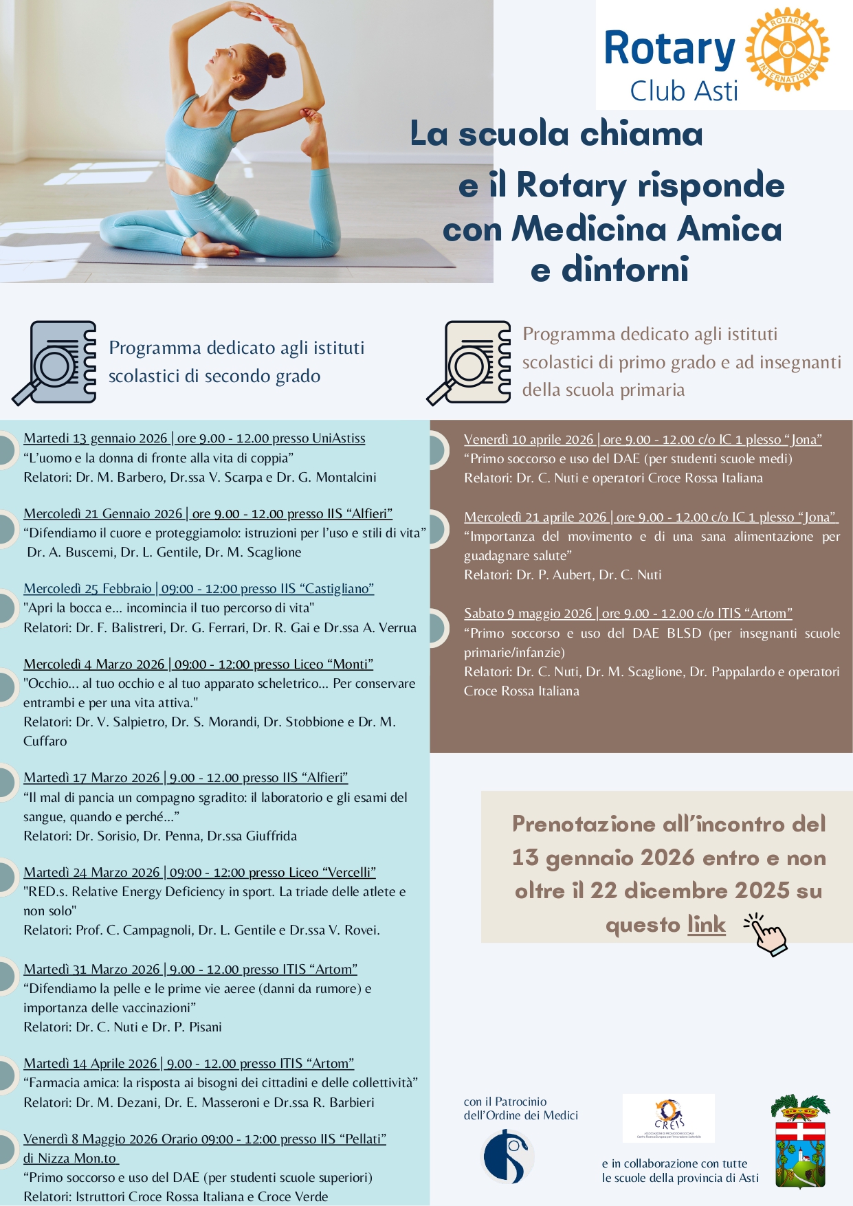 La prevenzione entra nuovamente nelle aule scolastiche. Prenderà il via martedì 13 gennaio la quattordicesima edizione di “Medicina amica”, il progetto promosso dal Rotary Club di Asti che porta i soci che svolgono la professione di medici e professionisti sanitari nelle scuole superiori del territorio per diffondere una cultura consapevole della salute e del benessere. Un percorso che, anno dopo anno, si è consolidato con una visione chiara: per essere davvero efficace, la prevenzione deve cominciare dall'adolescenza.