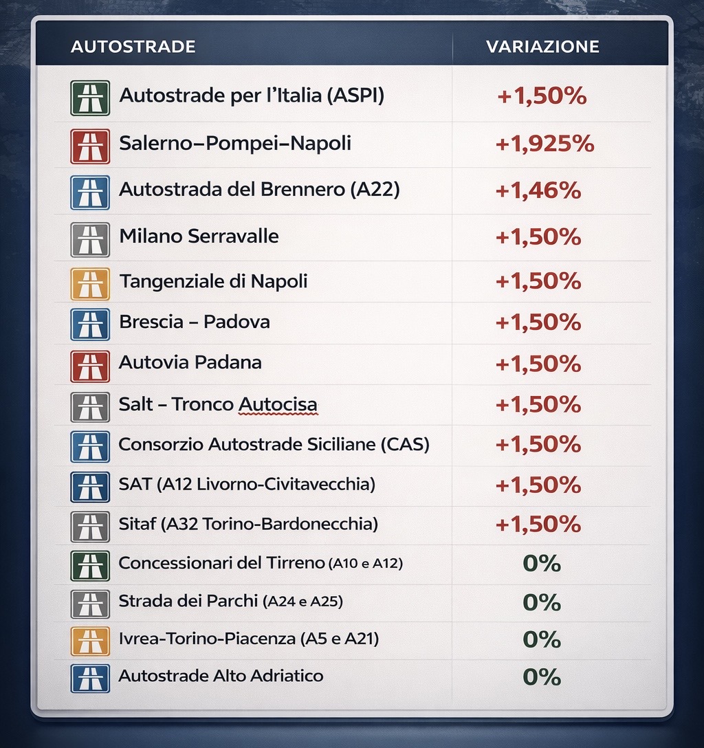 Tra i primi aumenti scattati dal 1° gennaio ci sono quelli dei pedaggi autostradali, con un adeguamento medio dell’1,5%, in seguito alla sentenza della Consulta. Non tutte le tratte sono coinvolte, ma il sistema autostradale italiano si conferma tra i più costosi d’Europa.