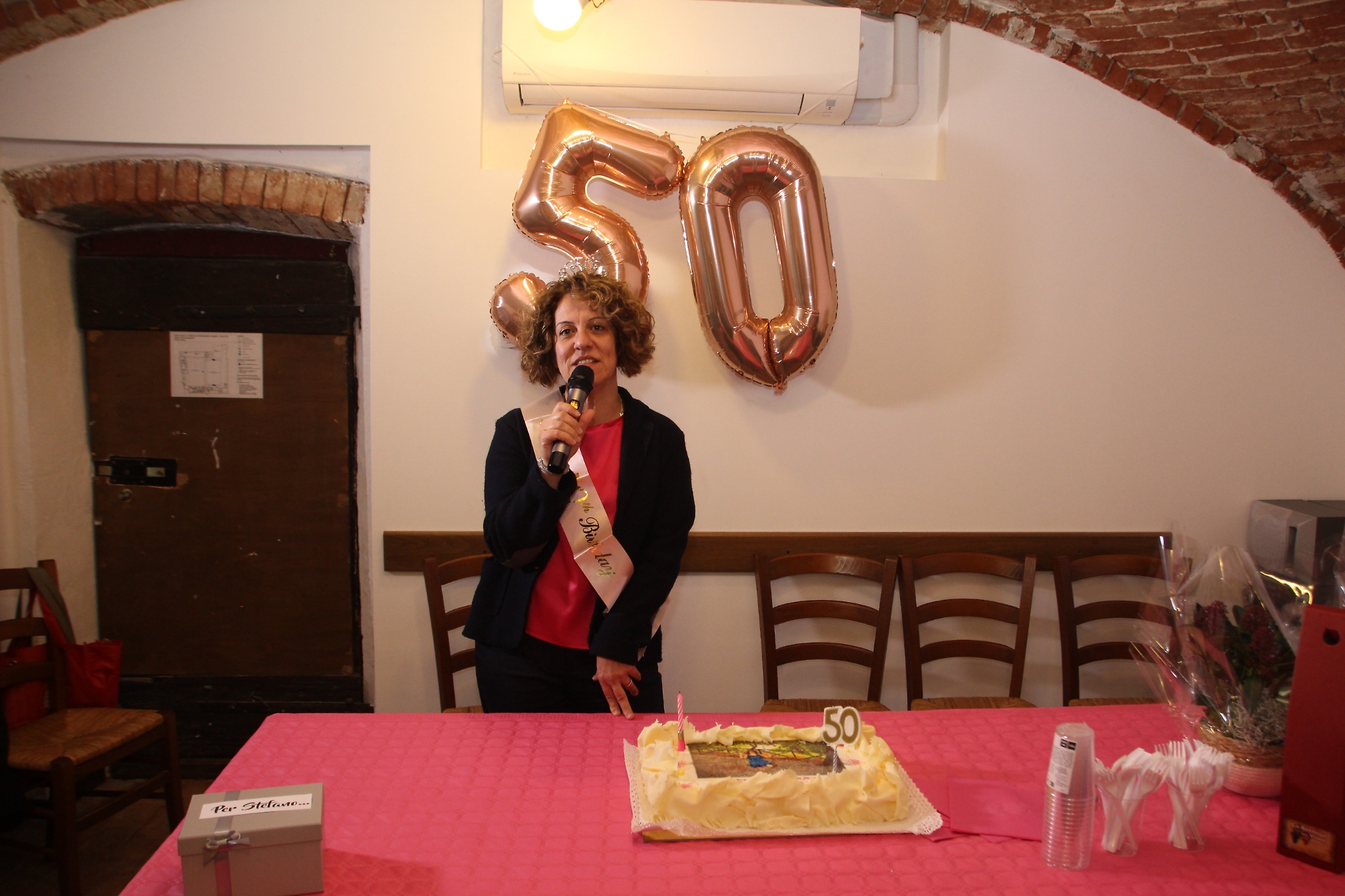 La festa per i 50 anni di Evelin, con in basso a sinistra la cassetta per raccogliere le offerte in memoria di Stefano (Credit photo: Riccardo Gerbi)