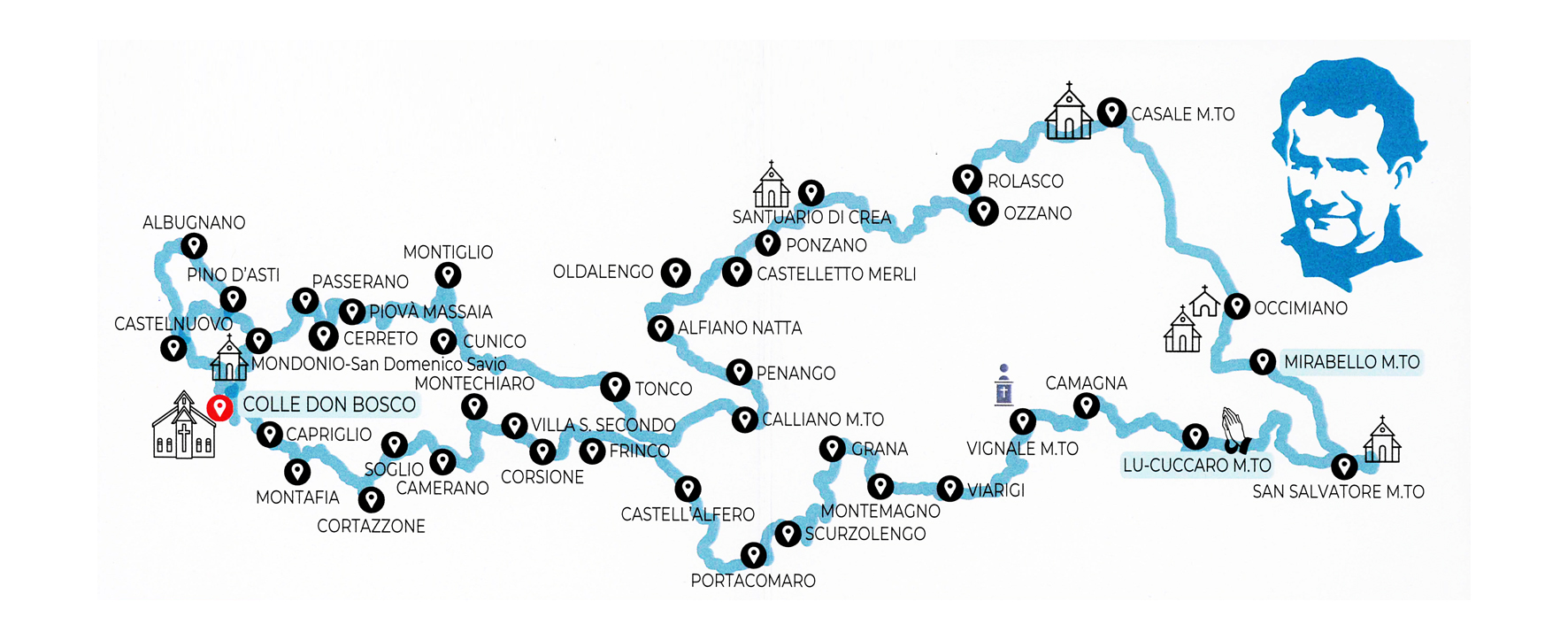 Ecco gli itinerari: Colle Don Bosco - Montechiaro; Montechiaro - Portacomaro; Portacomaro - Vignale Monferrato; Vignale - San Salvatore Monferrato; San Salvatore - Casale Monferrato; Casale - Santuario di Crea; Santuario di Crea - Calliano; Calliano - Montiglio Monferrato; Montiglio - Pino d’Asti; Pino - Colle Don Bosco.