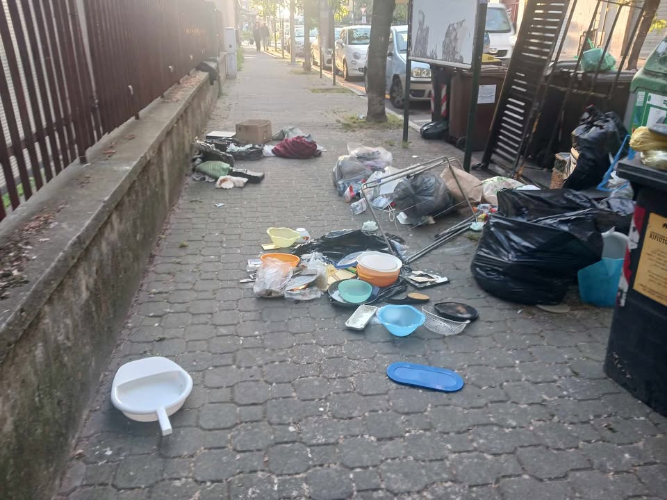 Quello che dovrebbe essere un normale lunedì mattina di ripartenza si è trasformato nell'ennesima cronaca di un degrado annunciato. Passeggiando lungo il marciapiede, i residenti non si trovano davanti solo ai resti di una serata brava, ma a un accumulo sistematico di rifiuti e oggetti domestici. Una campana del vetro, già deturpata da scritte e graffiti vandalici, è letteralmente sommersa. Ai suoi piedi, in un ammasso informe, giacciono cartoni di birra, sacchi neri ricolmi di rifiuti e cassette di plastica. Ma ciò che lascia più sbigottiti è la presenza di oggetti che nulla hanno a che fare con la "movida" e che testimoniano un'inciviltà radicata: stendibiancheria arrugginiti, scolapasta, ciotole in plastica colorata, spazzole per capelli e persino vaschette di varie dimensioni sono sparsi lungo il marciapiede.