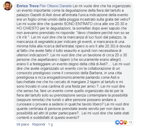 A criticare l’organizzazione dell’evento, almeno nei quattro momenti delle degustazioni organizzate sabato a Palazzo Gazelli, è stato il noto chef Enrico Trova che su Facebook ha postato alcune immagini della location, di cui contesta la scarsa presenza di indicazioni all’esterno, ma anche l’immagine che ne veniva fuori: «Ho cercato di mangiare due tajarin al tartufo - scrive Trova - e mi sono trovato in una cantina di una festa per amici».