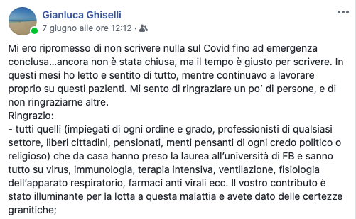 I ringraziamenti del dottor Ghiselli, ma quelli davvero ironici, per non dire peggio, vanno a quelle persone «impiegati di ogni ordine e grado, professionisti di qualsiasi settore, liberi cittadini, pensionati, menti pensanti di ogni credo politico o religioso che da casa hanno preso la laurea all’università di Facebook e sanno tutto su virus, immunologia, terapia intensiva, ventilazione, fisiologia dell’apparato respiratorio, farmaci anti virali, etc. Il vostro contributo è stato illuminante per la lotta a questa malattia e avete dato delle certezze granitiche». A questi aggiunge «tutti gli esperti di metabolismo, acidosi respiratoria e metabolica correlata all’uso di mascherine chirurgiche: non sapete che sollievo avete dato a tutti i chirurghi del mondo con la dimostrazione che tantissimi erano già morti e non lo sapevano; finalmente potranno riposare in pace. E per noi che la usiamo ancora, grazie, almeno possiamo fare testamento subito».
