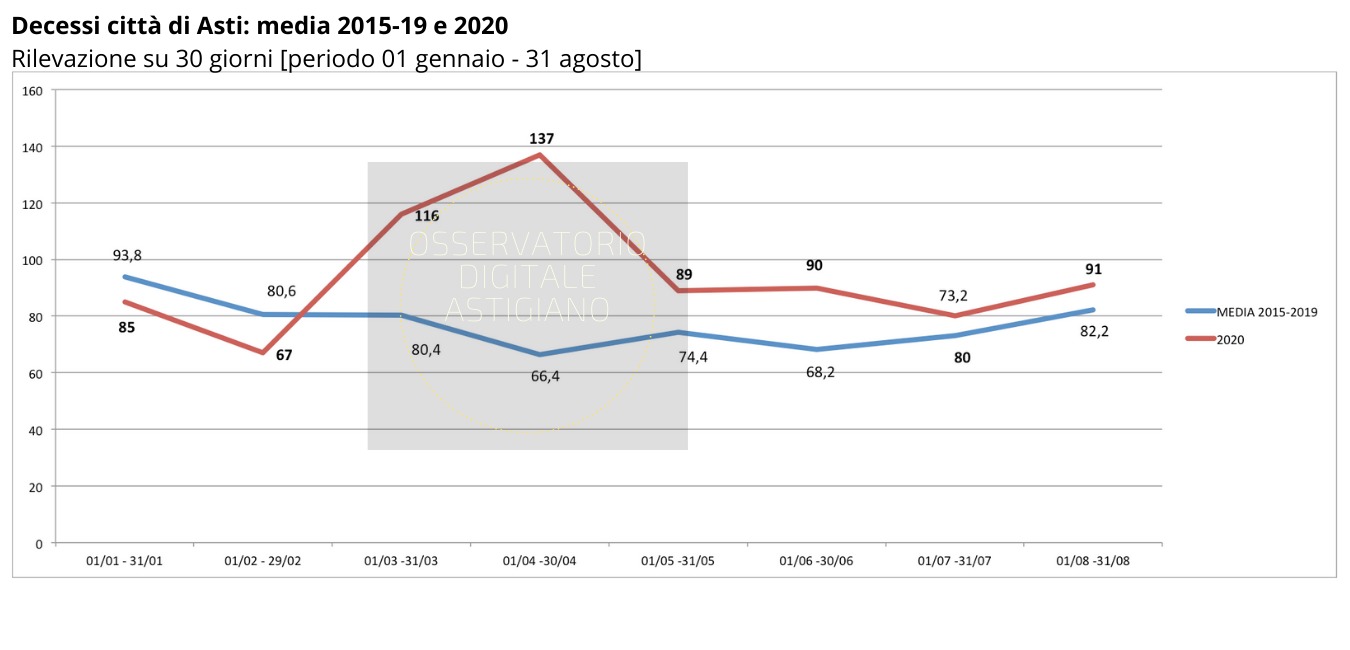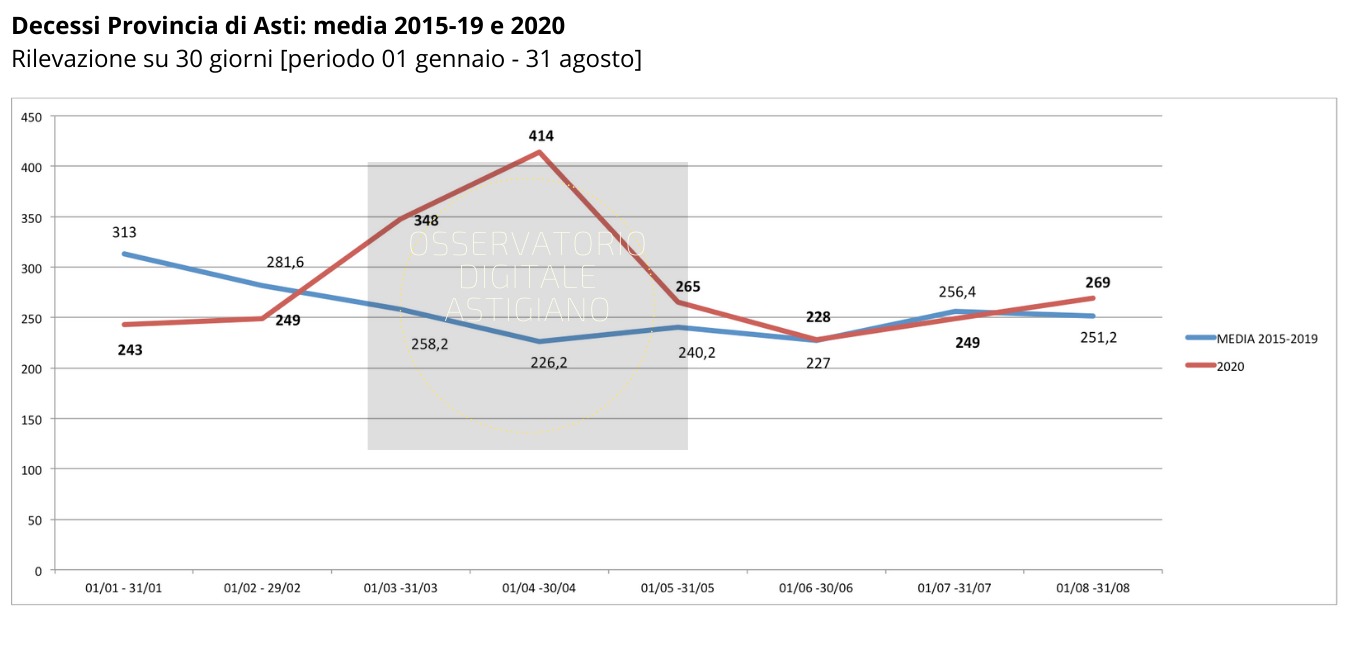 Dal 1° gennaio al 31 agosto del 2020 la provincia di Asti ha visto impennare il numero dei decessi, così come il resto del Piemonte. A fornire un’analisi dei dati locali su base statistica e con i numeri divulgati dall’Istat è l’Osservatorio Digitale Astigiano (https://www.osservatoriodigitaleastigiano.it/) che nasce dalla volontà di condividere, in modo semplice e intuitivo, i dati provenienti dagli ambienti digitali con la comunità astigiana.